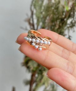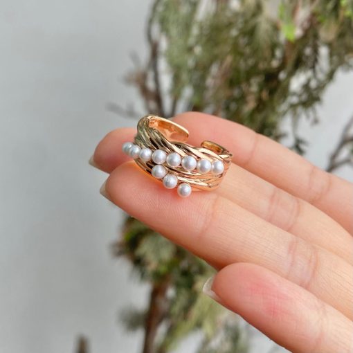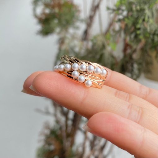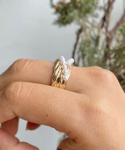 Hermoso anillo trabajado en acero quirúrgico 316L, con doble baño en oro de 18K. y perlas.