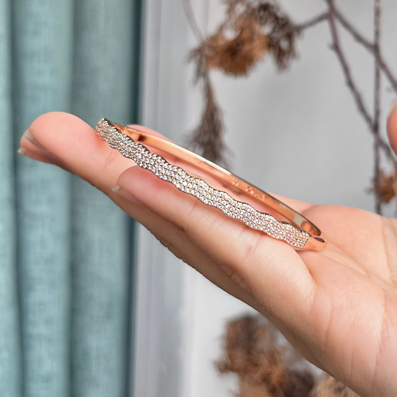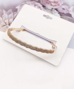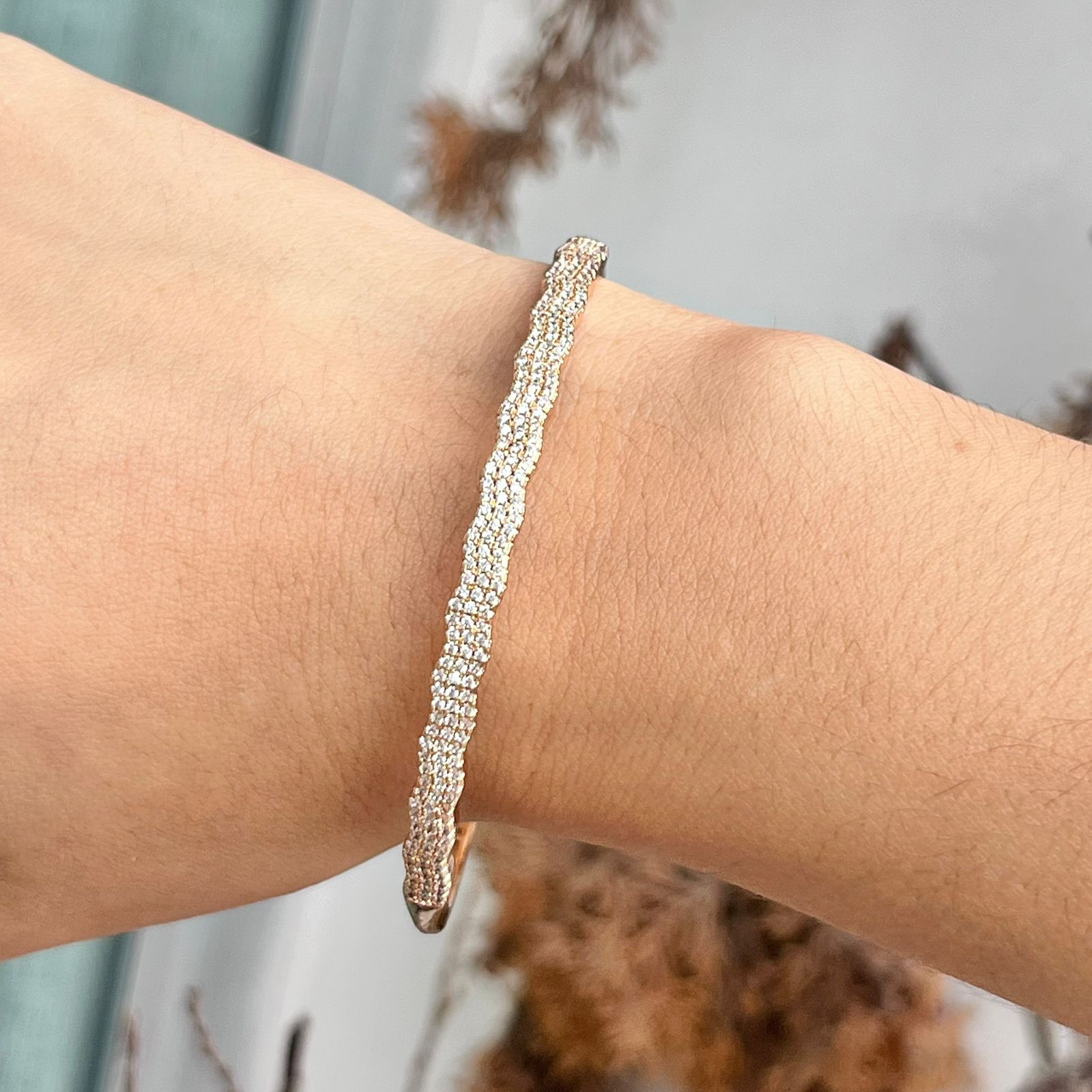 Moderno brazalete trabajado en acero 316L, con doble baño en oro de 18K. e incrustaciones de cristales.