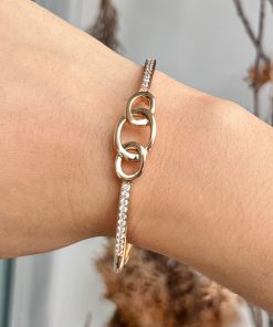Moderno brazalete trabajado en acero 316L, con doble baño en oro de 18K. e incrustaciones de cristales.