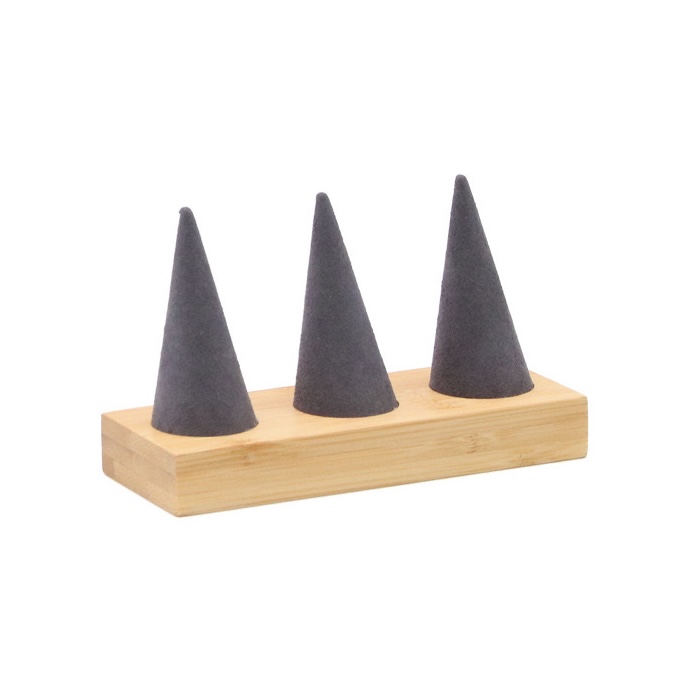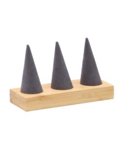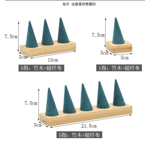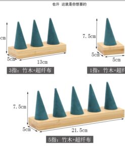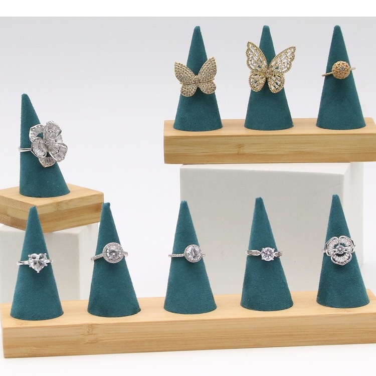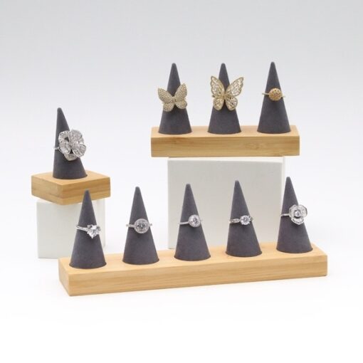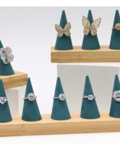 Exhibidor de anillos en fina pana con base de madera. Presentación elegante de joyería estable práctico para anillos.